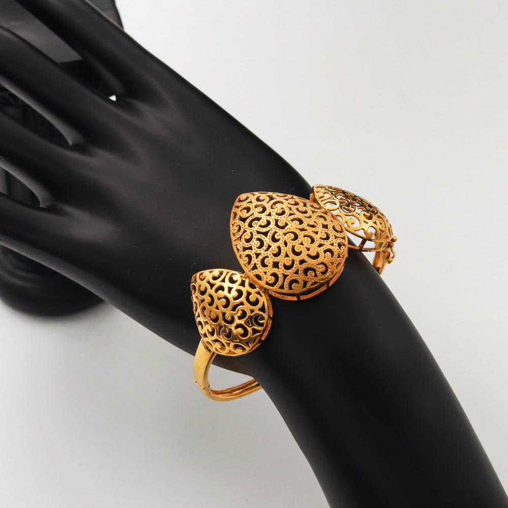 تمتعي بإطلالة مُلوكية كلها فخامة مع طقم الطوق الكبير بشكل رائع ليكون قطعة بالغة الجمال مزين بأشكال الدمعة المزخرفة الجميلة، من مجموعة نواعم دبي عيار 21 قيراط مناسب لشبكة للخطوبة أو للزواج.