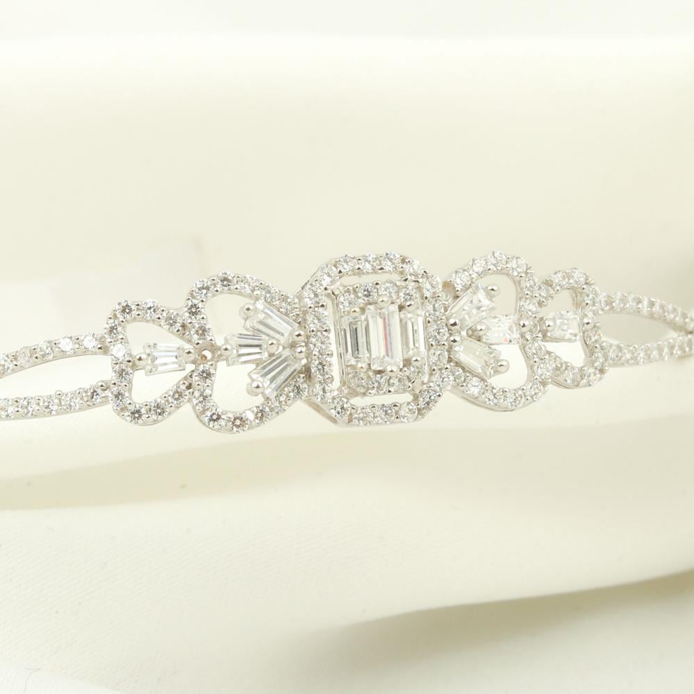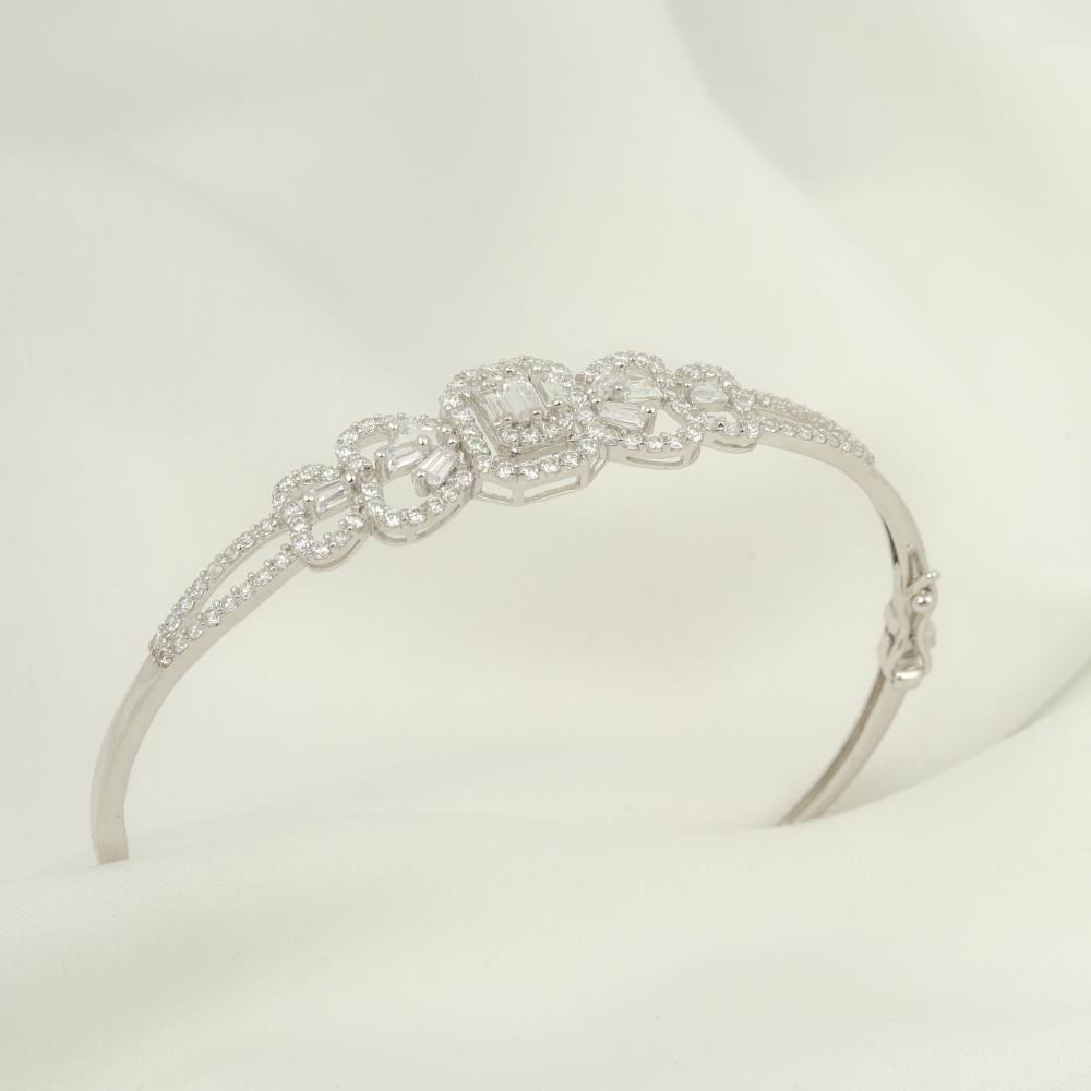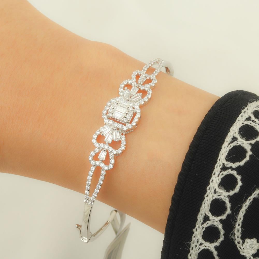 اسورة وخاتم أبيض مزين بشكل مربع مزخرف ومرصع بفصوص الزركون والباقيت الرائع لتتمعتي بإطلالة مفعمة بالأنوثة، مقدم من مجموعة نواعم العماري عيار 18 قيراط.