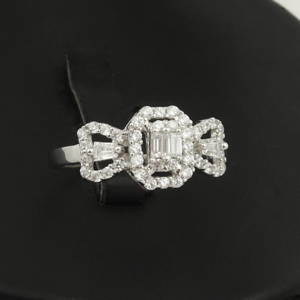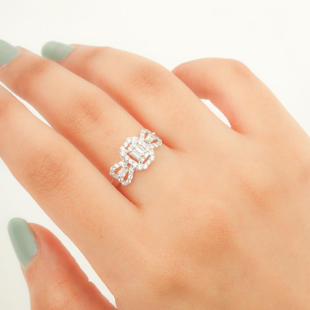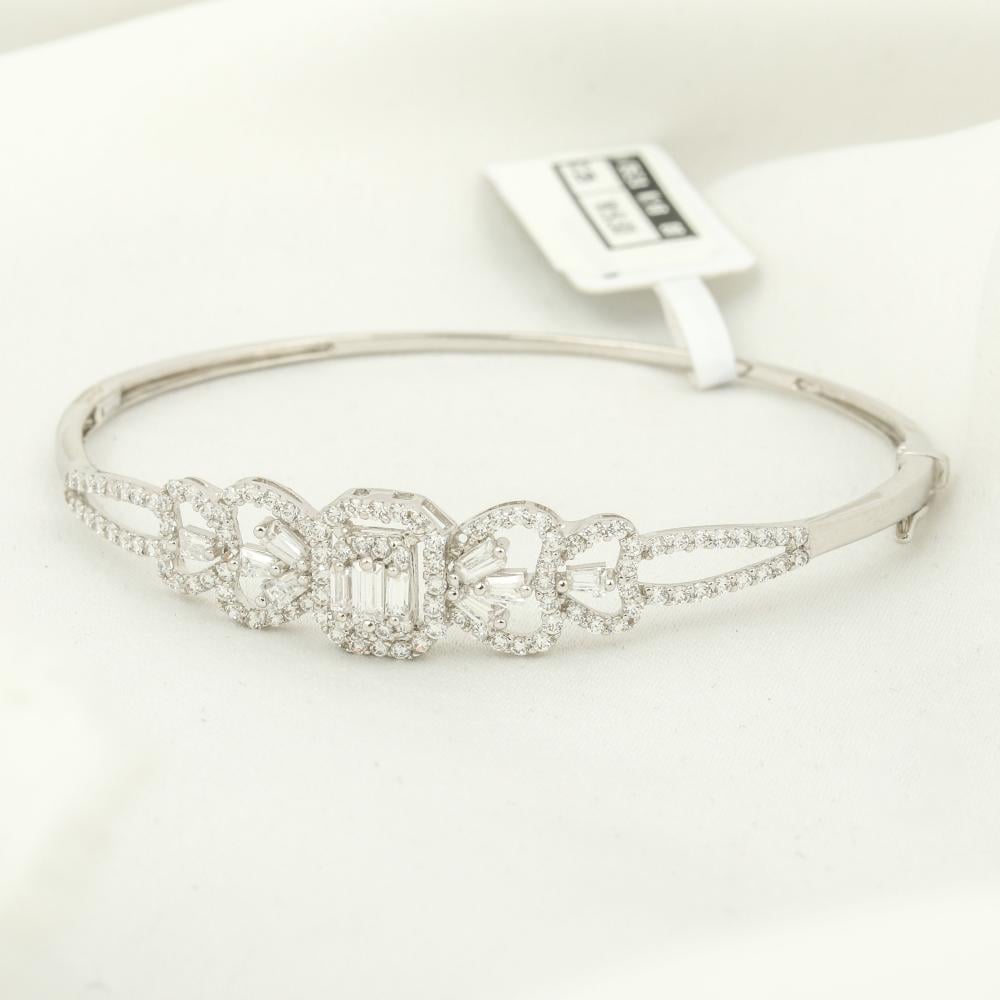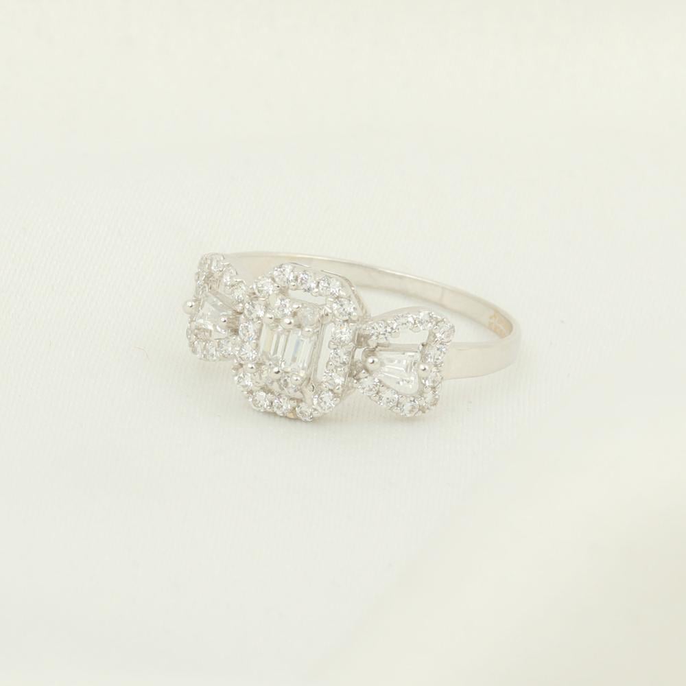 اسورة وخاتم أبيض مزين بشكل مربع مزخرف ومرصع بفصوص الزركون والباقيت الرائع لتتمعتي بإطلالة مفعمة بالأنوثة، مقدم من مجموعة نواعم العماري عيار 18 قيراط.