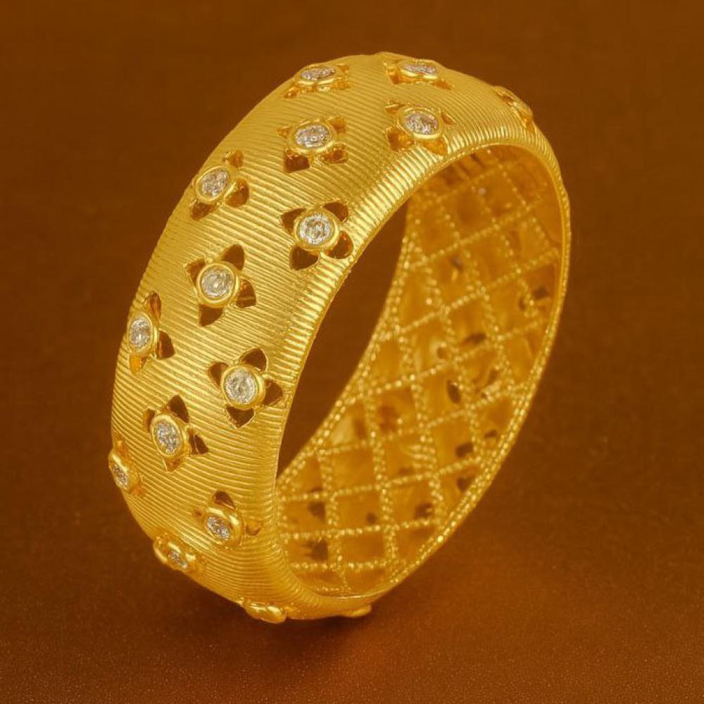 دبلة تتناغم فيها الزهور المتقاربة كأنها سرّ من أسرار الجمال، مرصّعة بفصوص الزركون المتلألئة لتزيدك بهاءً. من مجموعة نواعم العماري، صُممت لتروي حكاية أنوثة ناعمة لا تُنسى.