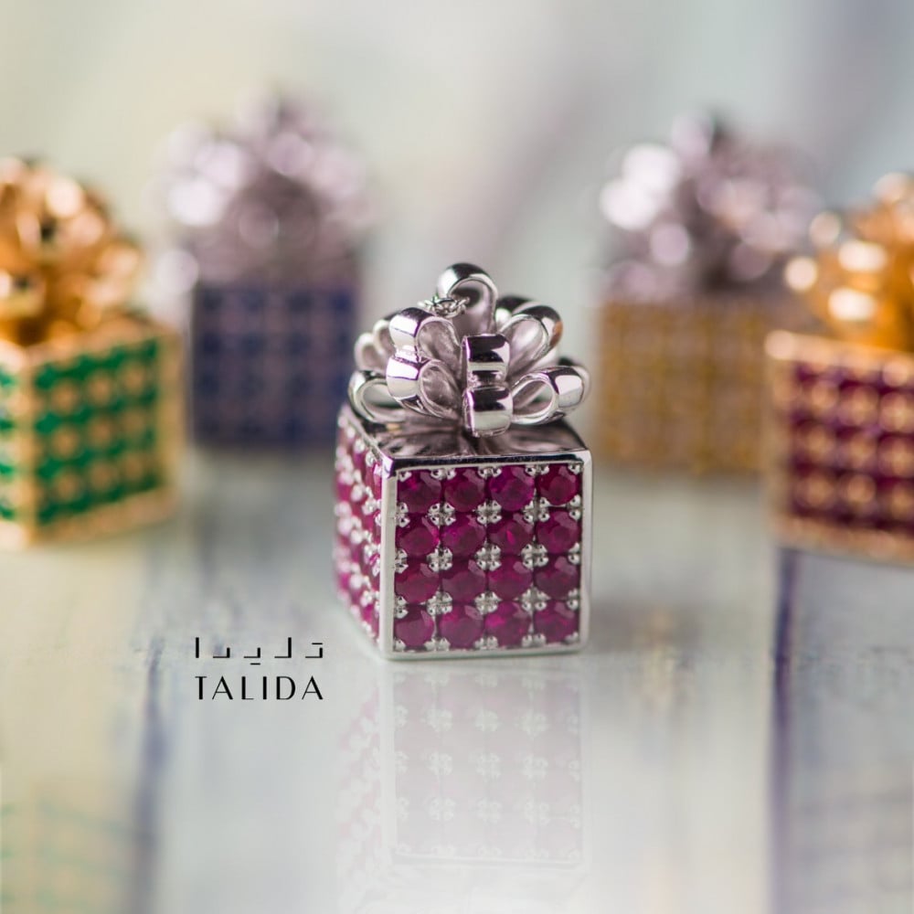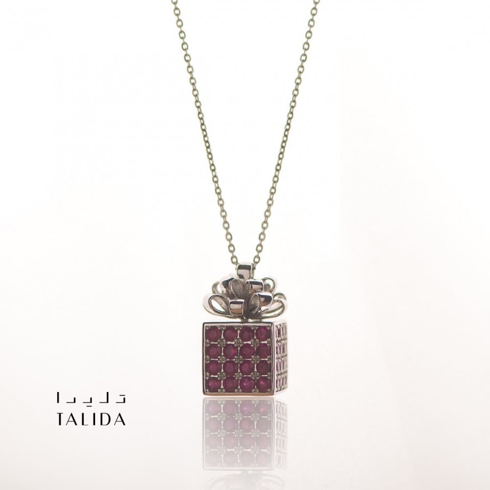 تأتي التعليقة ضمن مجموعة مجوهرات تليدا وهي عبارة عن تعليقة على شكل علبة هدايا مزينة بدوائر بلون الياقوت الأنيق، جمال لا يقاوم