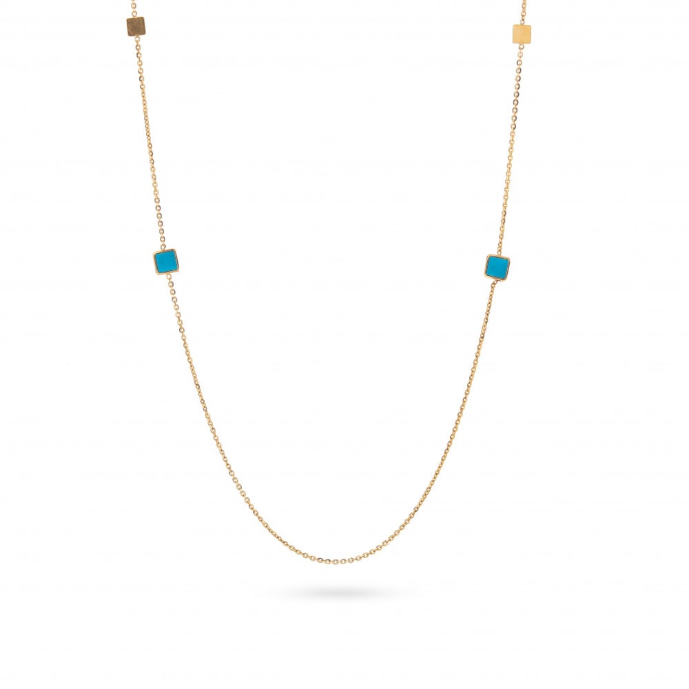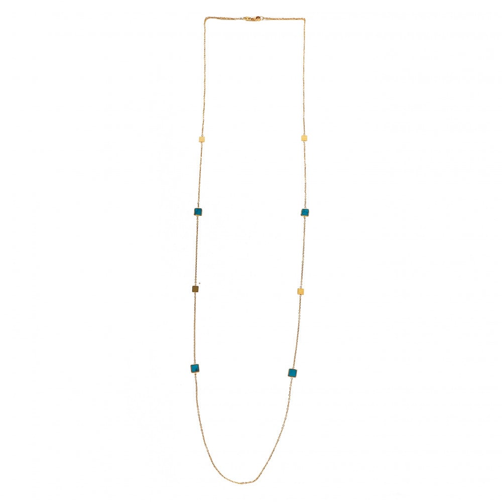 العماري للذهب لا ينسى السيدات التي تحب البساطة في مجوهراتها، لذلك صمم هذا الشال عيار 18 قيراط من نواعم العماري مزين بمربعات لامعة بلون فيروزي مميز حتى تتميزي في كل مكان وزمان!