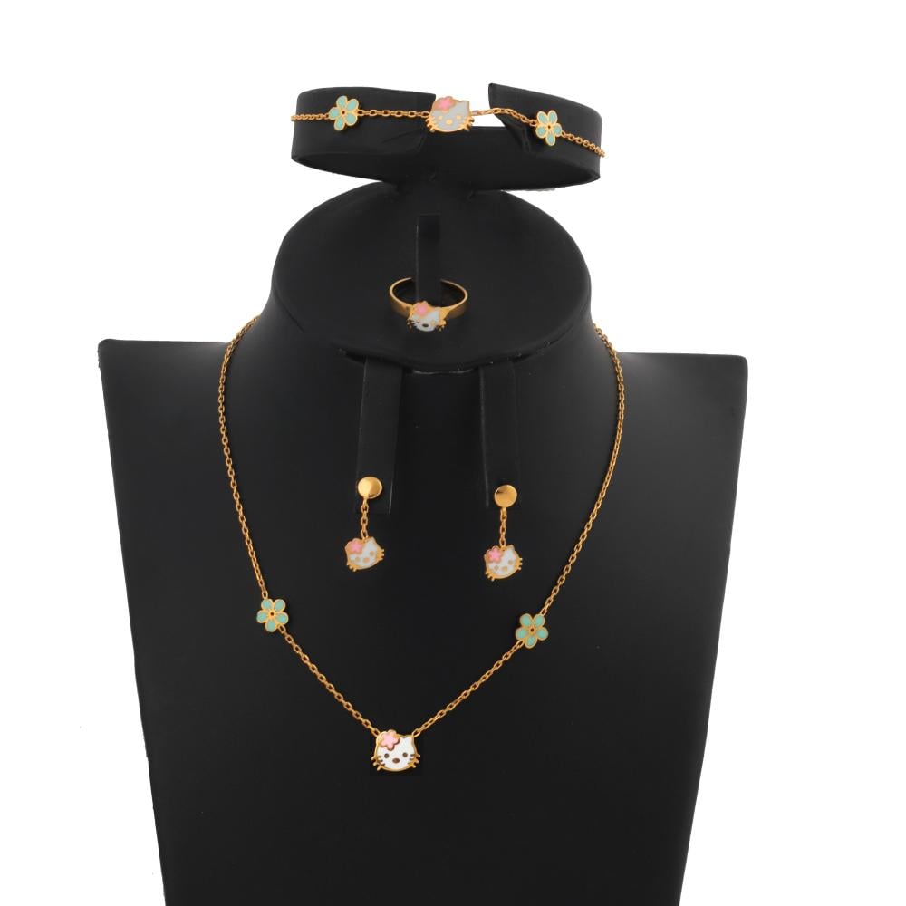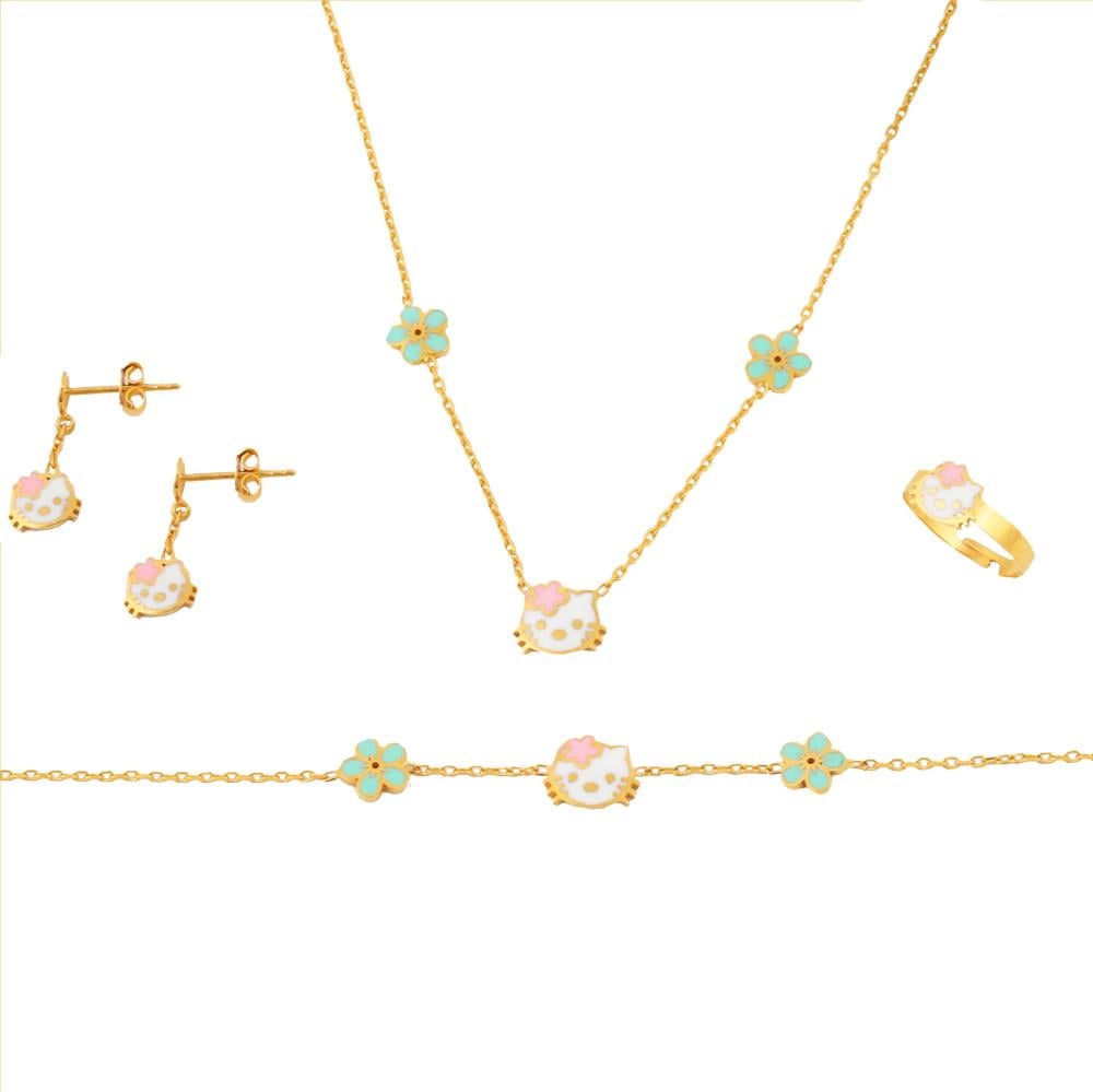 طقم ذهب اطفال عيار 21 قيراط مزين باشكال لولو كاتي وبالميناء الملون