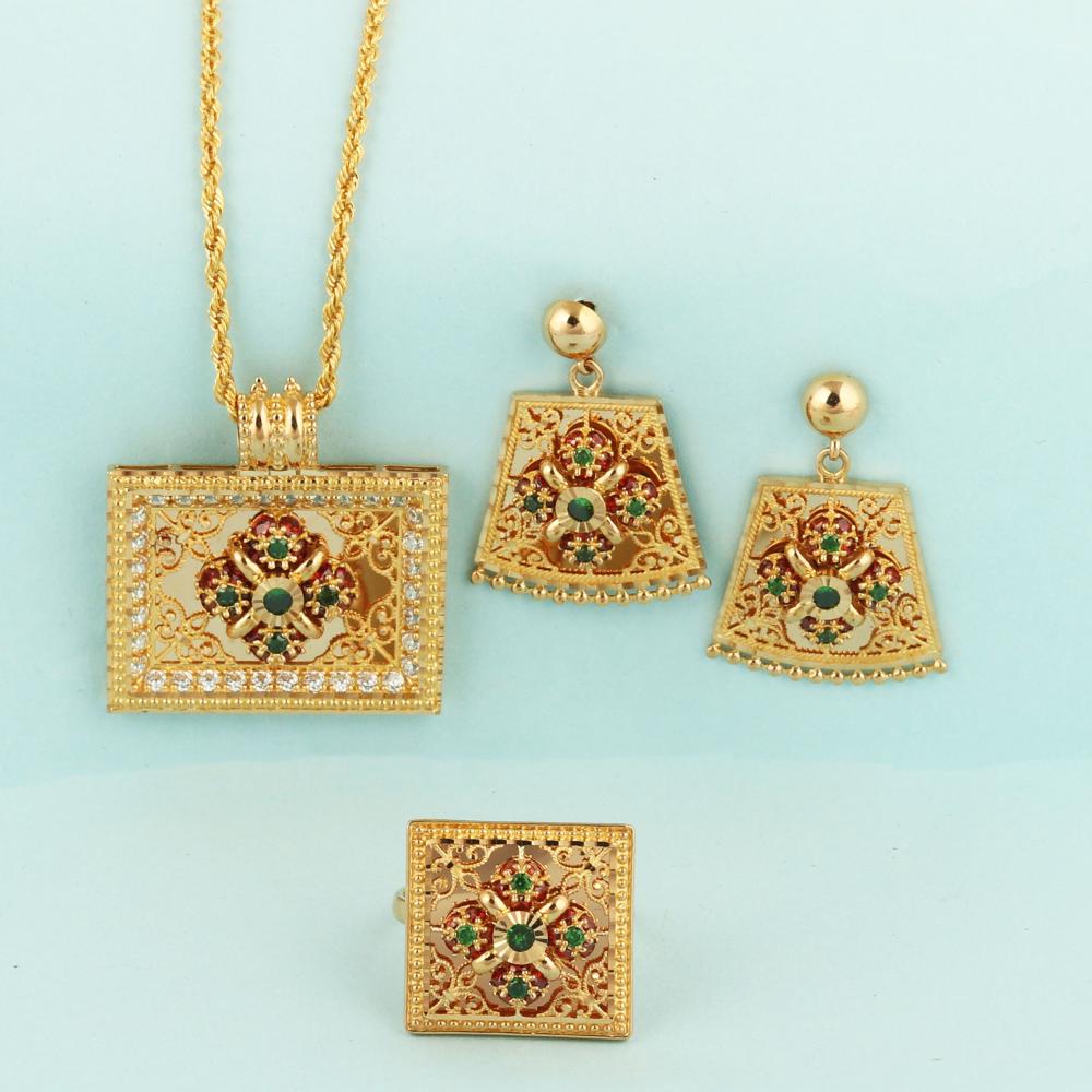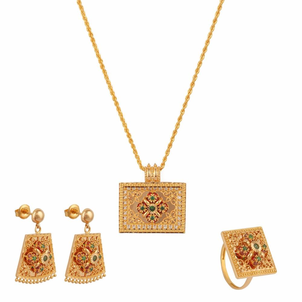 التفاصيل الدقيقة التي تزين القطعة تحكي قصصًا خالدة، تتداخل فيها نقوش الذهب البارزة مع الأحجار الملونة الزاهية التي تضيف عمقًا وروحًا للمظهر. كل حجر كريم وضع بعناية، ليعكس ألوان الطبيعة والحياة، في مزيج متناغم يشبه لوحة فنية تتحدث عن الثقافة والجمال.