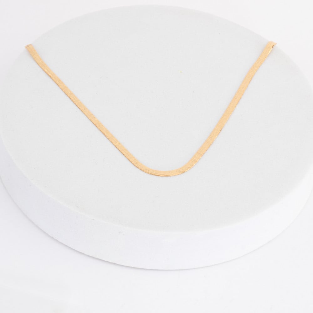 عقد من الذهب الأصفر عيار 18 قيراط مقدم ضمن مجموعة نواعم العماري, يتكون من خط واحد طولي من الذهب المسطح, كلاسيكيّة مفرطة تجعل من العقد قطعة أساسية في جميع مناسباتك.