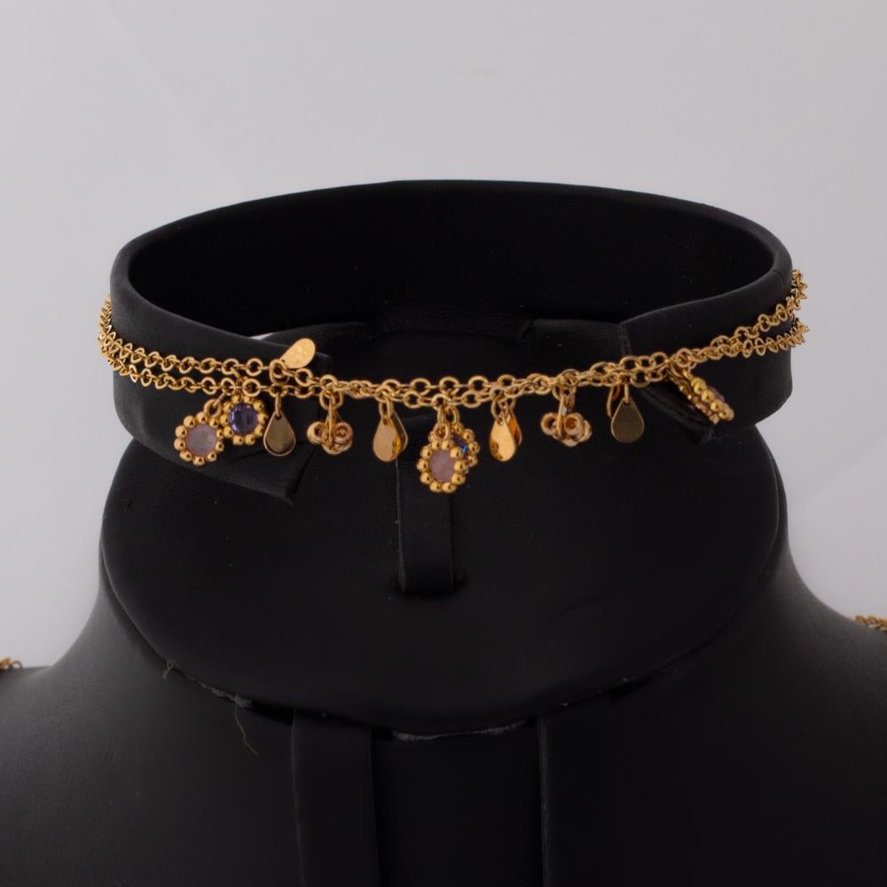 ستعشقين تفاصيل هذه القطعتين الرائعه المطروح في مجموعة نواعم العماري , عقد واسورة ذهب دورين فرفشة مزين بفصوص الزركون الملونة مع امكانية فصل العقدين , لإضافة المزيد من الفخامة إلى التصميم.